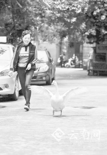 云南网讯 昨日,市民蒋阿姨带着自己的爱宠在新闻南路附近溜达时,吸引了不少路人驻足围观。遛猫遛狗都“弱爆”了,蒋阿姨遛的是一只大白鹅。