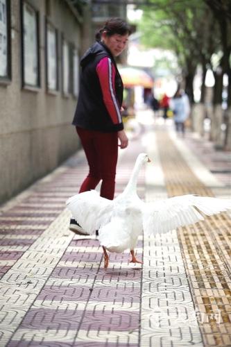 每天早上和傍晚,蒋阿姨出门散步时,总是带着大白鹅一起溜达。即使不拴绳子,它也会高昂着头,摇摇摆摆紧跟在蒋阿姨身边。在家里,大白鹅有自己专门的饭盆和水盆,吃东西的频率快得惊人。