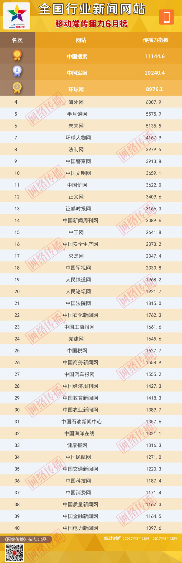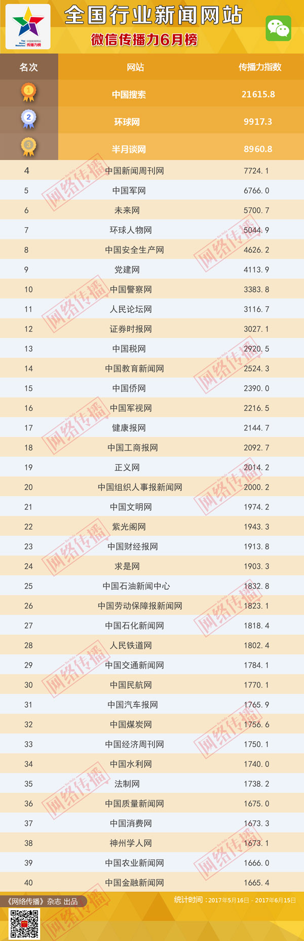中央网信办《网络传播》杂志倾力打造的“全国行业新闻网站传播力2017年6月榜”今日发布。