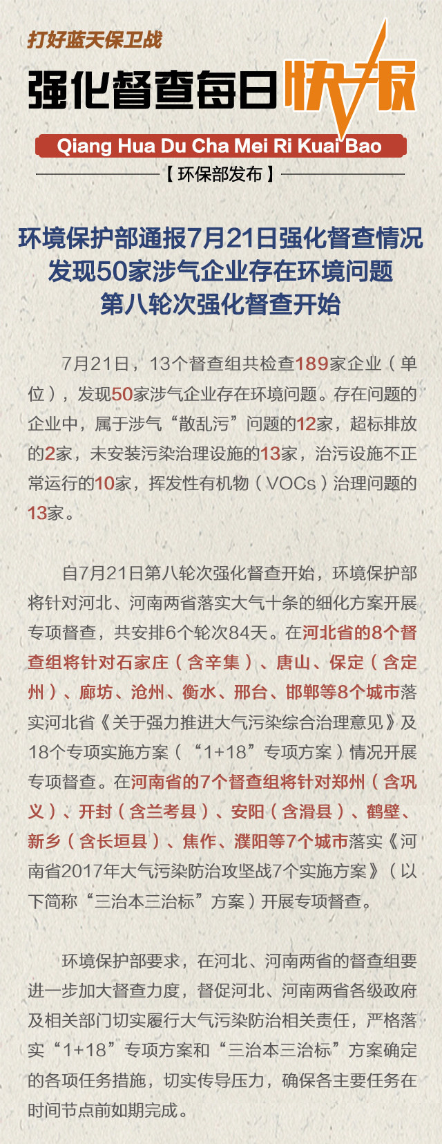中新网7月23日电 据环境保护部宣传教育司官方微博消息,环保部针对京津冀及周边地区的强化环保督查,7月21日,13个督查组共检查189家企业(单位),发现50家涉气企业存在环境问题。