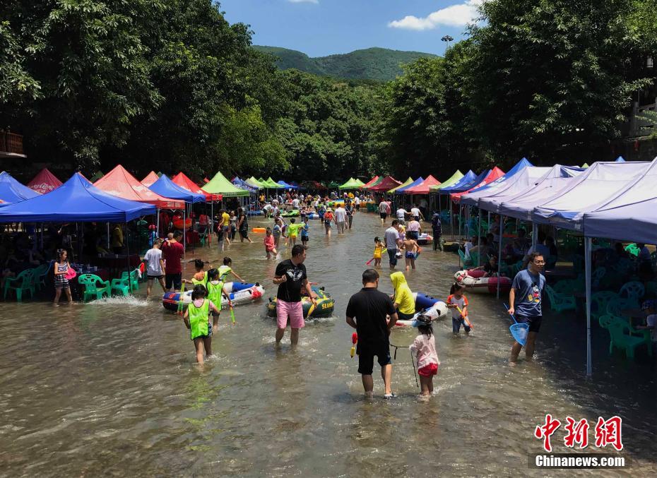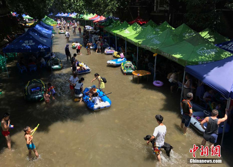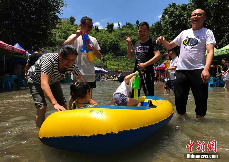 7月22日,重庆北碚偏岩古镇河滩上,数百张餐桌铺在河床上,民众赤脚浸泡在清凉的河水中进餐,并在水中搓麻将消暑。当日,重庆发布“高温橙色预警”信号,多个区县气温突破40℃。图为市民在水中玩耍纳凉。中新社记者 周毅 摄