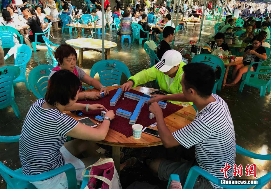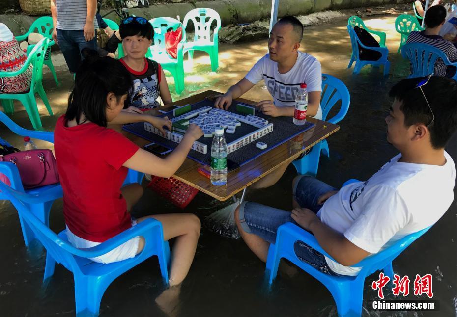 7月22日,重庆北碚偏岩古镇河滩上,数百张餐桌铺在河床上,民众赤脚浸泡在清凉的河水中搓麻将消暑。当日,重庆发布“高温橙色预警”信号,多个区县气温突破40℃。中新社记者 周毅 摄