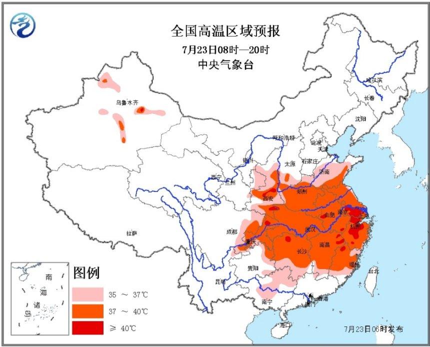 中新网7月23日电 据中央气象台官网消息,中央气象台7月23日06时继续发布高温橙色预警:预计,7月23日白天,西北地区东部、黄淮、四川盆地东部、江汉、江淮、江南、华南北部等地有35℃以上的高温天气,其中,陕西关中地区、河南、山东南部、安徽、江苏、上海、浙江、福建、江西、湖北、湖南、四川盆地东部、重庆等地的部分地区最高气温可达37~39℃,局地可超过40℃。