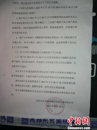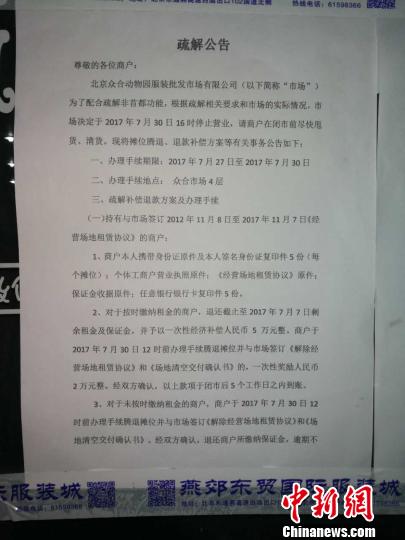 中新网北京7月26日电 (记者 曾鼐)北京“动批”众合市场26日贴出正式疏解公告,经营18年的众合将于本周日正式闭市。
