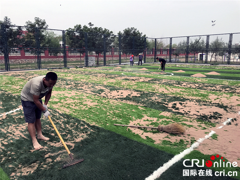 村民正在铺设人造草皮足球场