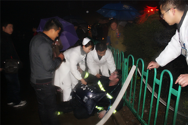 安徽省怀远县一居民楼突发大火,由于火势较大,该楼3层至7层的20余名居民被困楼上。为扑救大火,今年刚刚加入消防支队的年轻党员战士连续工作5个小时,在火场有些缺氧的他去掉头盔后跌倒在路边。