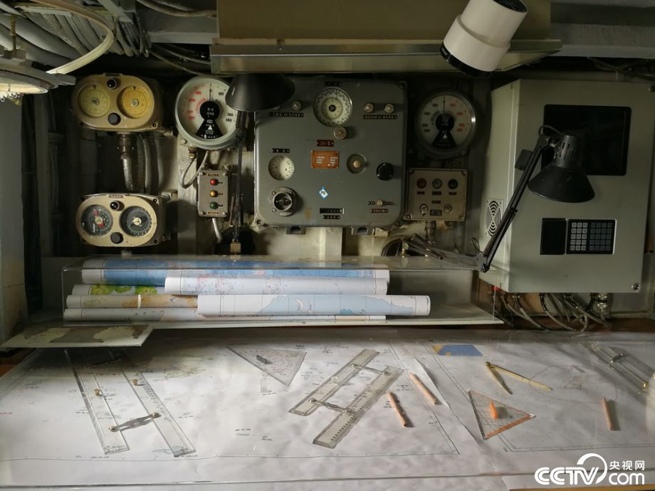 航程仪表盘前摆放着不同种类的地图和坐标工具。(记者 袁育堃 报道)