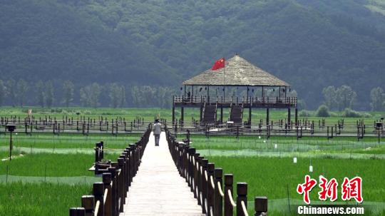 当地在水田上搭起了木栈道,做起了观光农业。郭佳 摄
