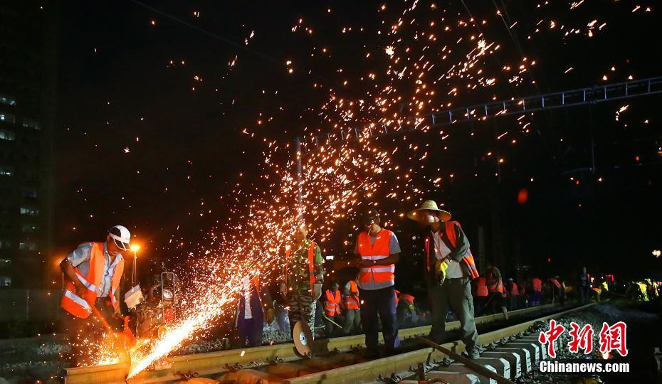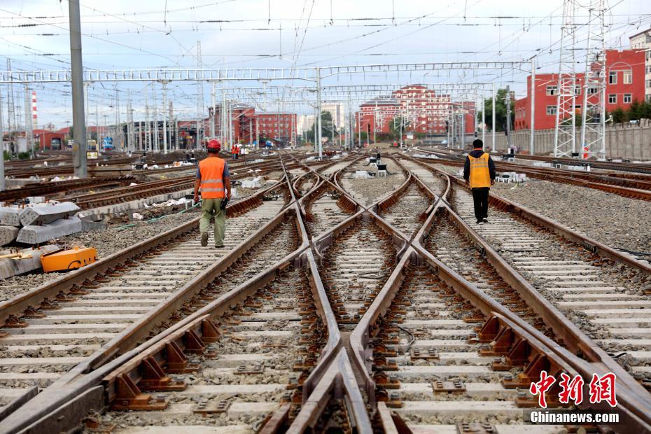 8月11日6时02分,随着K7106次旅客列车通过中国高寒地区正建的快速铁路客运通道“哈牡客专”线牡丹江站,标志着该条高寒高铁线的首座高速场正式投入使用。该高速场施工新铺的“5渡7交组合道岔”更刷新了高寒地区高铁施工难度的新纪录,其施工精细度和精准度相当于在“心脏上绣花”。图为施工人员对最后一段普速轨道进行换轨作业。中新社记者 王舒 摄