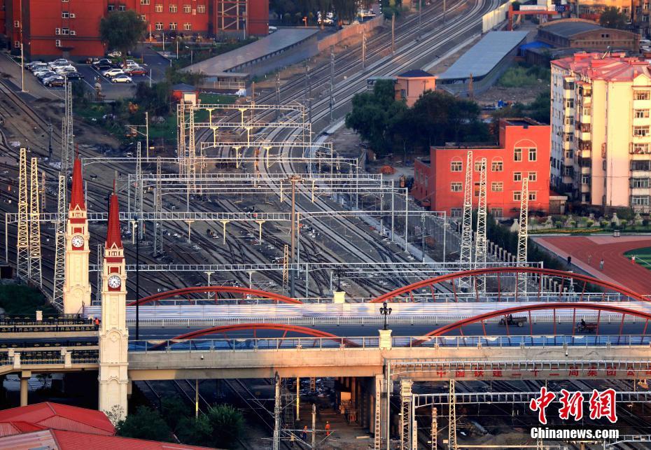 8月11日6时02分,随着K7106次旅客列车通过中国高寒地区正建的快速铁路客运通道“哈牡客专”线牡丹江站,标志着该条高寒高铁线的首座高速场正式投入使用。该高速场施工新铺的“5渡7交组合道岔”更刷新了高寒地区高铁施工难度的新纪录,其施工精细度和精准度相当于在“心脏上绣花”。图为俯拍“哈牡客专”首座高速场。中新社记者 王舒 摄