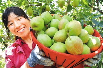 8月8日,新疆铁门关市博古其镇党建扶贫果园内贫困农民在采摘早酥梨准备销往海外市场。徐明生 常玉兰摄(人民视觉)