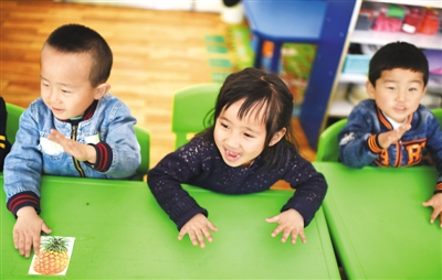 青海免费教育惠及各族学生。图为青海省黄南藏族自治州幼儿园小班教室内,藏族女孩夏央娜姆(中)和伙伴在课堂上。新华社记者 张宏祥摄