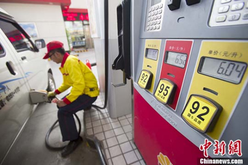 资料图:山西太原,加油站工作人员给车辆加油。 中新社记者 张云 摄