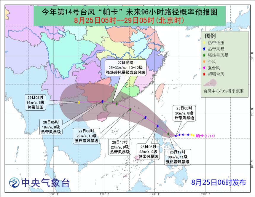 中新网8月25日电 中央气象台预计,今年第14号台风“帕卡”将今天晚上在菲律宾吕宋岛东部沿海登陆,穿过吕宋岛后将于26日白天移入南海东部海面,尔后转为向西北方向移动,逐渐向广东中部到海南东部一带沿海靠近,并将于27日在上述沿海登陆。