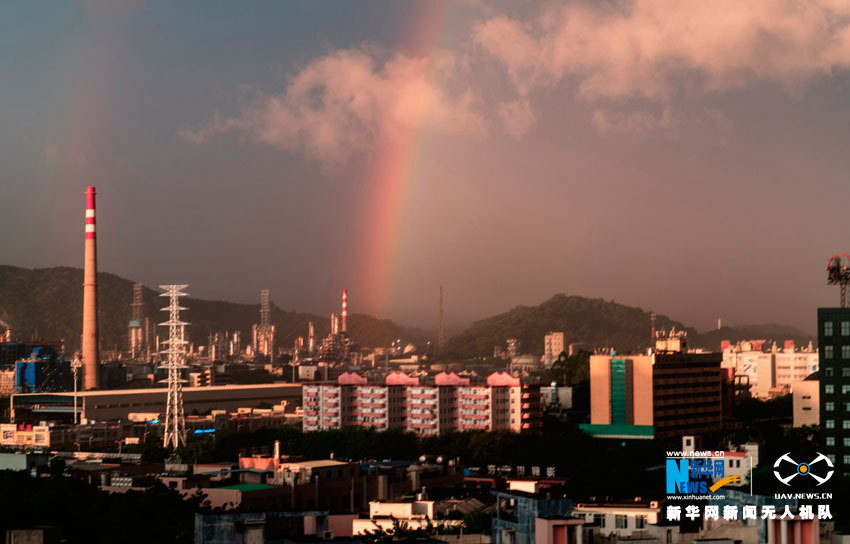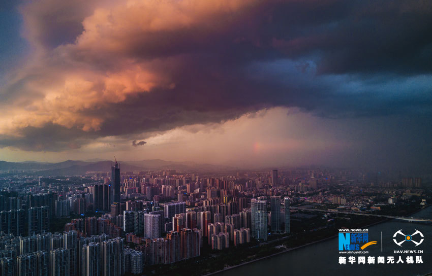 东边红光普照,西边乌云压境狂风大作,这时彩虹在黄埔区上空显现。新华网发(曾铠钢 摄)