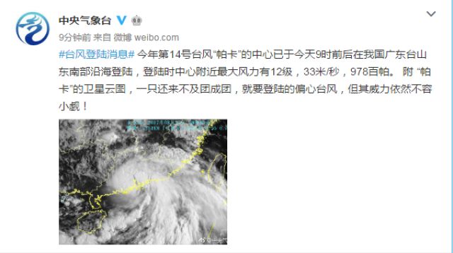 今年第14号台风“帕卡”的中心已于今天9时前后在我国广东台山东南部沿海登陆,登陆时中心附近最大风力有12级,33米/秒,978百帕。 附 “帕卡”的卫星云图,一只还来不及团成团,就要登陆的偏心台风,但其威力依然不容小觑!