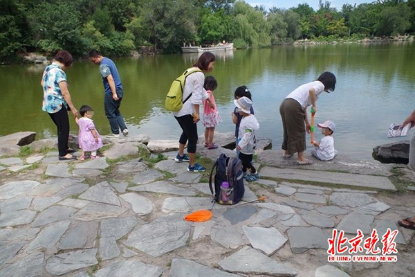 8月26日,天朗气清,未名湖沿岸聚满了许多孩子和家长。记者走访发现,不少人正往未名湖里投面包屑,还有的带着小鱼兜。