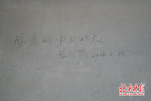 新刷的石灰墙上又添了新的刻字——“龙××必上北大”。记者26日走访时发现,依然有大人孩子钻进护栏,在里面跑来跑去。新刷的石灰墙上又添了新的刻字——“龙××必上北大”,庙门上还可见“我是北大副校长”、“北大等我”……