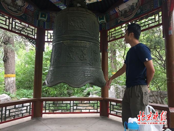 统一着装的一群小朋友路过钟亭,其中一个小男孩跑进亭子,用旅游旗的小棍子猛撞了两下钟体,接着飞奔离开。一对母女开心地钻到钟底下嬉戏、拍照……钻入钟底的母亲称:“没太注意告示,看到大家都来敲钟,也就进来了。”
