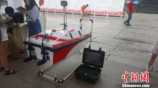 展览的另一边,重庆市勘测院工作人员李维平正在给市民介绍水下智能测量的无人船。“这种无人船名为水域机器人,它能实现无人操纵进行水下监测,船上配备了定位系统、声呐系统、高精度传感设备等。”李维平表示。