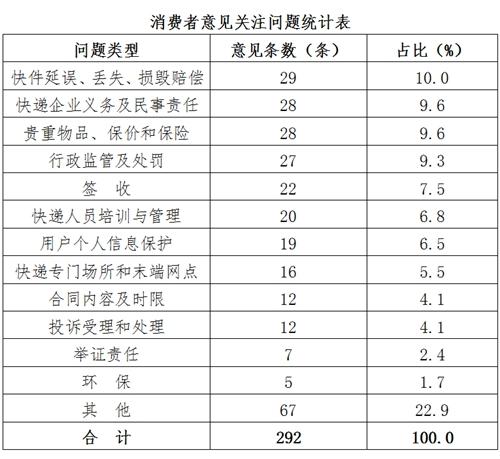 从关注的问题看,围绕《快递暂行条例(征求意见稿)》和有关消费者权益的重点问题,消费者意见比较集中的前五位分别是快件延误、丢失、损毁的赔偿问题(占10.0%);快递企业义务及民事责任(占9.6%);贵重物品、保价和保险问题(占9.6%);行政监管及处罚(占9.3%);签收问题(占7.5%)。