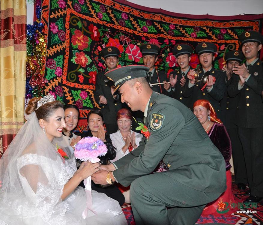 2007年8月25日,麦尔旦与阿依夏相识于乌鲁木齐第二十中学,从相识到恋爱再到结婚,他们用了整整十年的时间。今天,他们终于结束了这场“马拉松式的爱情”。图为即便是新娘追随到边关,这求婚的仪式自然也不能少。杜麒麟 刘慎 摄影报道 图片来源:中国军网