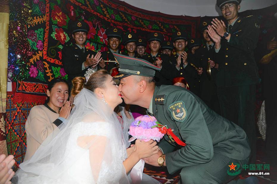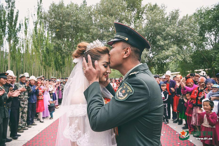 主持人宣布完,新郎麦尔旦激动地亲吻新娘。杜麒麟 刘慎 摄影报道 图片来源:中国军网