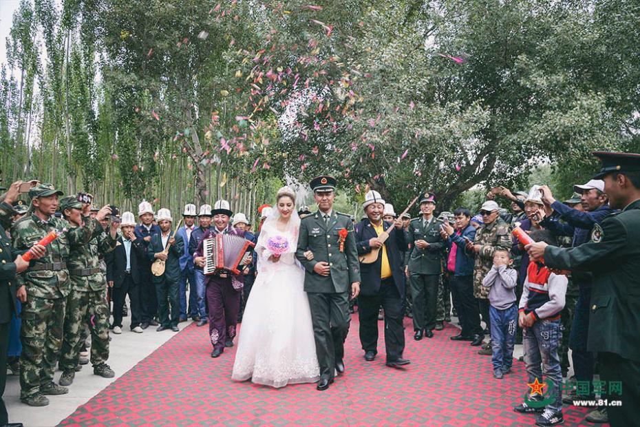 麦尔旦工作任务重,原定于今年2月的婚期一拖再拖。这让阿依夏的家人对麦尔旦产生了隔阂,懂事的阿依夏一直给家人做思想工作。今年5月,正在家里休假的麦尔旦知道阿依夏的母亲生病住进了医院,他一有时间就去照顾阿依夏的母亲,给阿姨煲汤、做营养饭食、陪阿姨聊天解闷,受到了女友家人的喜欢和认可。图为在声声祝福中步入婚礼现场。杜麒麟 刘慎 摄影报道 图片来源:中国军网