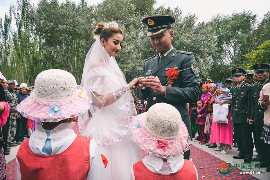 新郎麦尔旦为新娘阿依夏戴结婚戒指。杜麒麟 刘慎 摄影报道 图片来源:中国军网