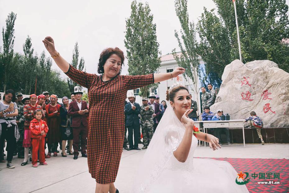 夫妻俩为前来贺喜的官兵和牧民群众跳舞。杜麒麟 刘慎 摄影报道 图片来源:中国军网