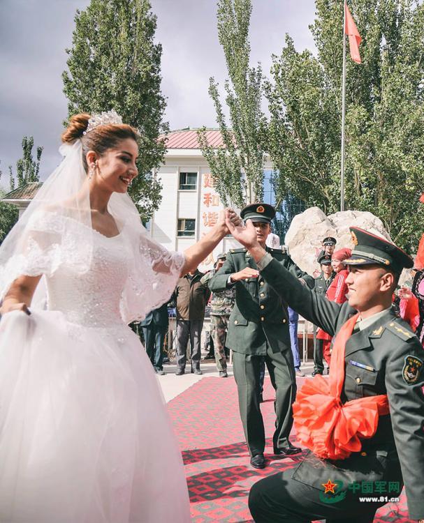 “你守边关我守你!”在这特殊的日子里,你不能回来完婚,我就前往边关去找你。一路上,乘火车、坐汽车、搭出租,从北疆的乌苏市到南疆的阿图什市相距2160公里,阿依夏花了整整两天时间赶到哨所,了解到这一情况后,全连官兵和驻地牧民群众为他们精心策划了一场柯尔克孜族婚礼。在官兵和牧民群众的声声祝福中,麦尔旦和阿依夏牵手走上红地毯,幸福地步入婚姻殿堂。杜麒麟 刘慎 摄影报道 图片来源:中国军网