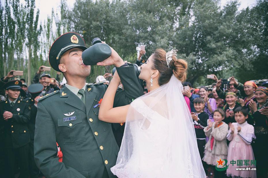 夫妻喝交杯酒。杜麒麟 刘慎 摄影报道 图片来源:中国军网