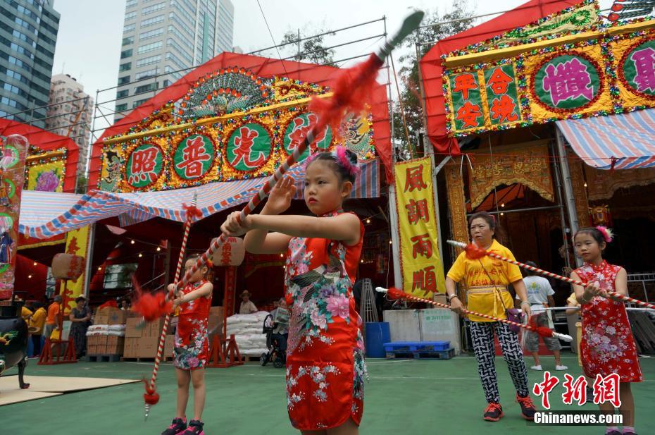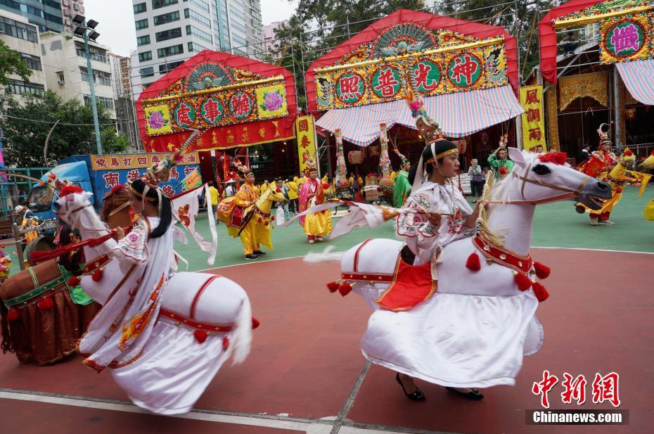筲箕湾潮籍乡亲一直致力推动地区文化艺术,几十年来在区内举办传统的盂兰胜会,除了弘扬孝道之外,均会筹演潮州戏曲及特色巡游活动,使传统的文化艺术得以流传。主办方表示,今年“潮州戏曲暨巡游文化汇演”活动,特别邀请了潮州剧团来港表演传统潮州戏曲,包括潮州布马舞、潮州大锣鼓队巡游。图为来自潮州揭阳的潮州布马舞,以其独特的艺术风格,被列为国家级非物质文化遗产。 中新社记者 洪少葵 摄