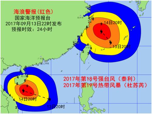 中新网9月13日电 据国家海洋预报台官方微博消息:台风“泰利”和“杜苏芮”一北一南继续影响我国海域。今晚21时,“泰利”位于距离浙江省象山县东南方向约530公里的海面上,未来将以每小时15公里左右的速度向北偏西方向移动,强度逐渐加强;“杜苏芮”位于距离海南省三亚市东偏南方向约610公里的海面上,并将以每小时20公里左右的速度向西偏北方向移动,强度逐渐加强。