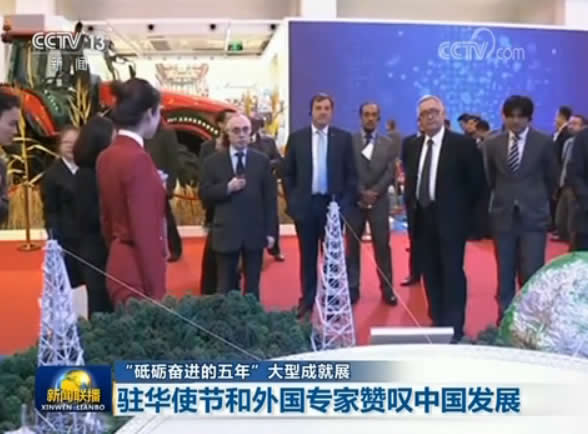 在展览现场,驻华使节和外国专家对我国五年来在经济、政治、文化等各领域的发展成就进行了详细了解。很多人一边参观一边讨论,尤其是在那些展现重大突破和创新成果的沙盘、模型前,还不时拿出手机进行拍照。