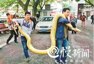 该负责人告诉重庆晚报记者,这条黄金蟒大约4岁,长度近5米。和同龄蟒蛇相比,它有点营养过剩。
