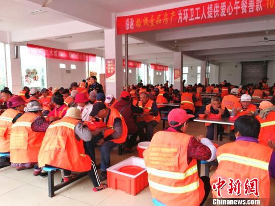 在睢城小学环卫工人爱心餐点,该县城管局相关负责人与160多位环卫工们一起过节。朱志庚 摄