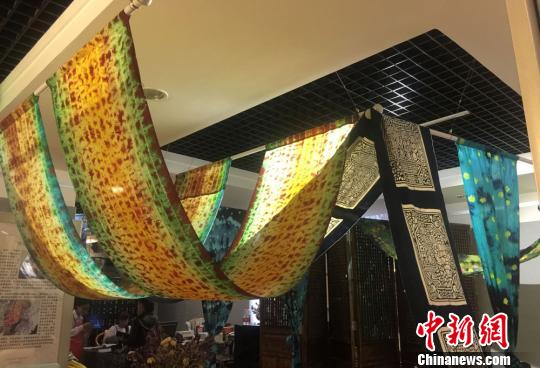 从10月23日开始,来自全国各地的30余名专家学者、非遗传承人在兰州交通大学进行为期一个月的染缬艺术研修学习,探讨非物质文化遗产传承与创新。图为兰州交通大学教授管兰生及其团队展示他们通过染缬技艺制作的作品。刘玉桃摄