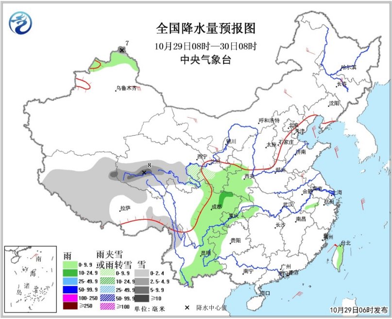 图2 全国降水量预报图(10月29日08时-10月30日08时)