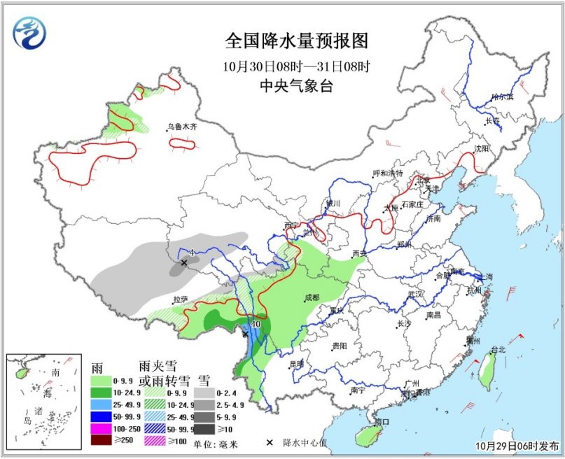 10月30日08时至10月31日08时,西藏中东部、青海南部、川西高原西部地区以及新疆西北部高海拔地区等地有小到中雪或雨夹雪;甘肃南部、陕西南部、四川大部、云南西部、西藏东南部等地有小到中雨,其中,云南西北部部分地区有大雨。内蒙古中东部、东北地区北部、浙闽沿海地区等地有4~6级风(见图3)。台湾海峡、南海北部和中部海域、南海西南部有7~8级、阵风9~10级的大风。