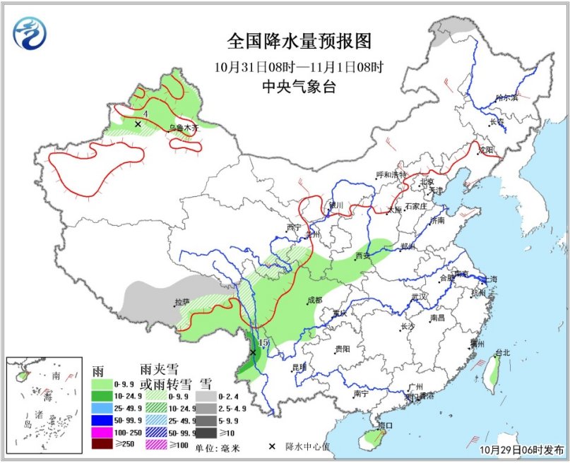10月31日08时至11月1日08时,新疆北部高海拔地区、西藏东部、青海东南部、川西高原西部等地有小雪或雨夹雪;山西南部、陕西南部、甘肃南部、四川大部、云南西北部等地有小到中雨或阵雨。内蒙古大部、华北北部、东北地区等地有4~6级风(见图4)。