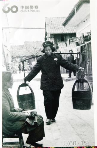 一张泛黄的黑白老照片里,挑着水迎面走来的年轻女子身着旧式警察服装,脸带微笑,朝气蓬勃,似乎正和旁边一名缝补衣服的老妇人说话……这张照片目前展览于南宁市公安局警察历史陈列馆里。陈列馆建馆时,民警整理资料发现,在新中国成立60周年公安部发行的一系列中国警察纪念卡里也有这么一张照片,与旧档案里的一张照片相同。由此引发疑问,纪念卡里的女民警很可能是南宁的警察。