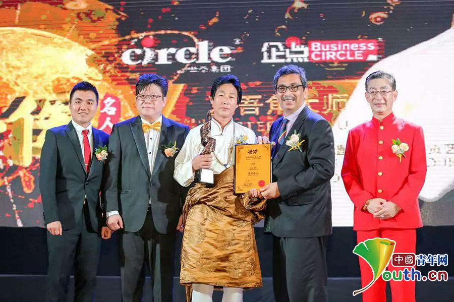 2016年,夏吾角(中)被马来西亚“世界杰出名人榜”授予“终身成就奖”,成为继中国著名表演艺术之家六小龄童之后,第二个获此殊荣的中国人。受访者供图