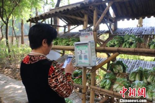 图为尚城国际小区设立的无人售卖菜摊,一居民在扫码付款林馨摄