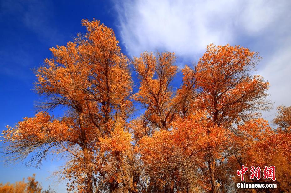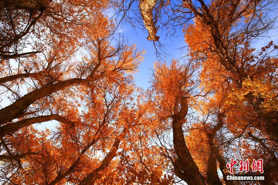 在深秋时节,位于新疆托克逊县库米什镇柯尔克孜铁米村以南5公里处的天山脚下,一片上百年的胡杨林坚韧挺拔,风景美如画。进入10月以来,这里的大片胡杨林进入最美观赏季。走进这里,仿佛进入了如诗如画的金色世界。金黄色的胡杨树叶随风飘荡,一条溪流从胡杨林中穿过,滋养着周边的“生灵”。胡杨是世界上最古老的一种杨树,以强大的生命力闻名,素有“大漠英雄树”的美称。图为挺拔在蓝天之下的胡杨树在秋季显得遒劲。 李靖海 摄