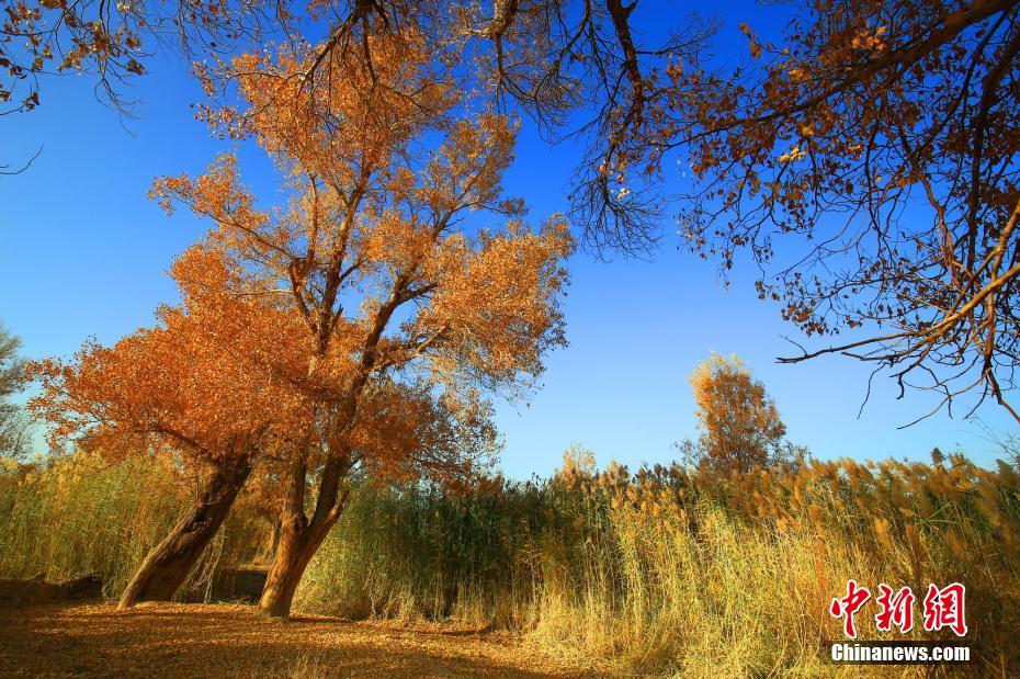在晚霞的照耀下胡杨树和芦苇都变得金黄。 李靖海 摄