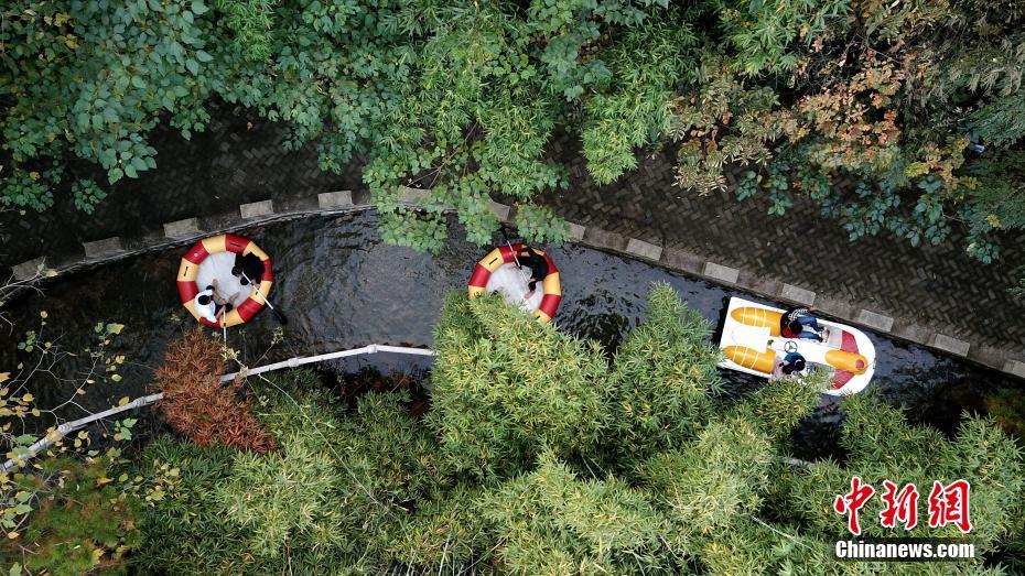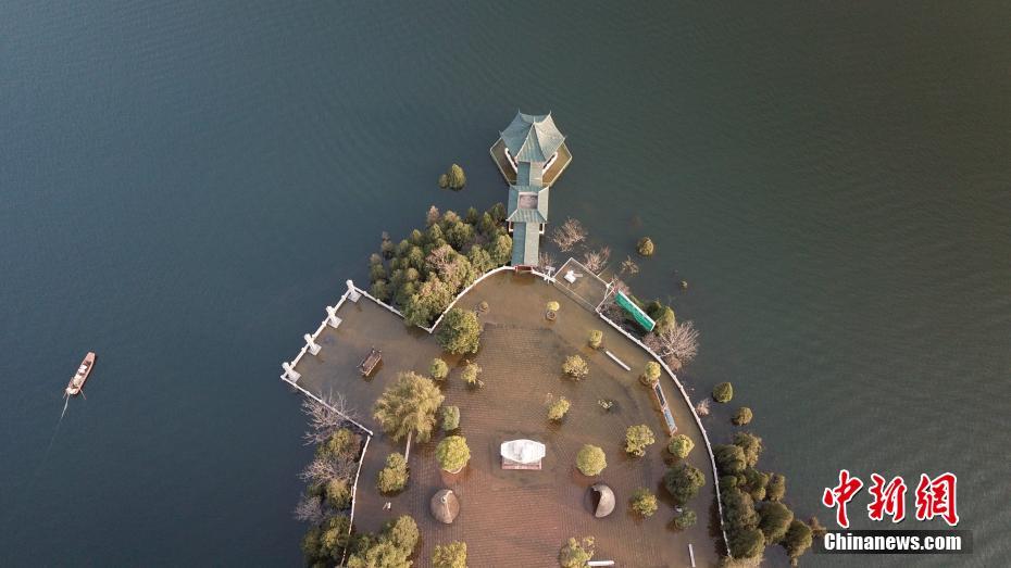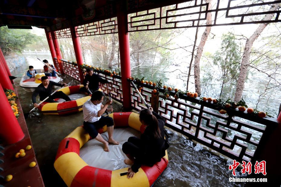 11月5日,河南淅川丹江大观苑,因水库水位持续上涨,蜿蜒于丹江河岸的数公里人行步道观景长廊被淹,观景长廊一时间变成水渠,一些民众步行走不了观景长廊,干脆“顺水推舟”在人行步道廊亭内改划船观景。图为蜒于丹江河岸的数公里人行步道观景长廊一片汪洋。 王中举 摄