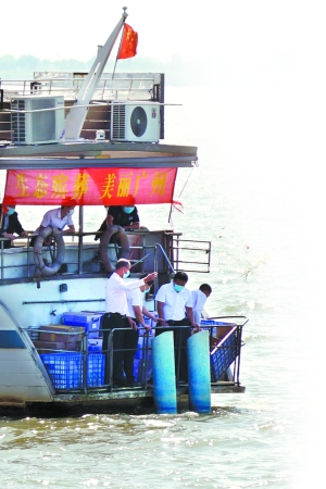 工作人员通过船尾导流槽将骨灰撒入大海