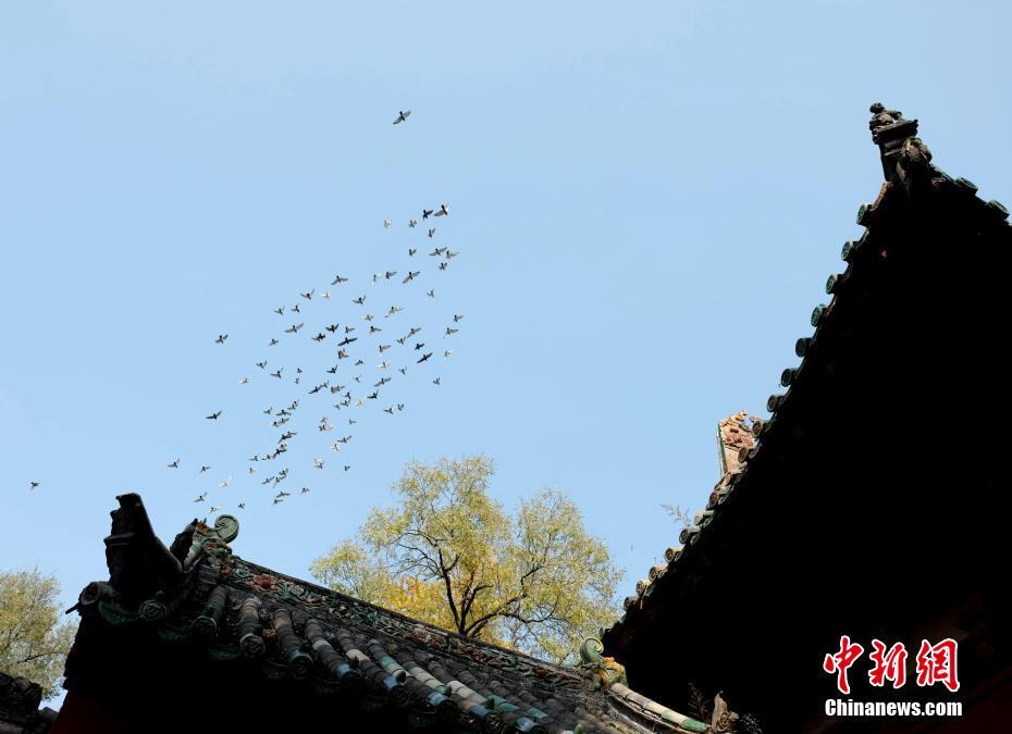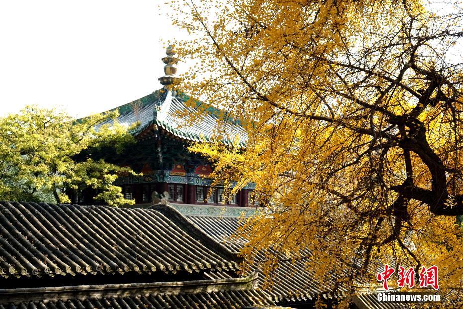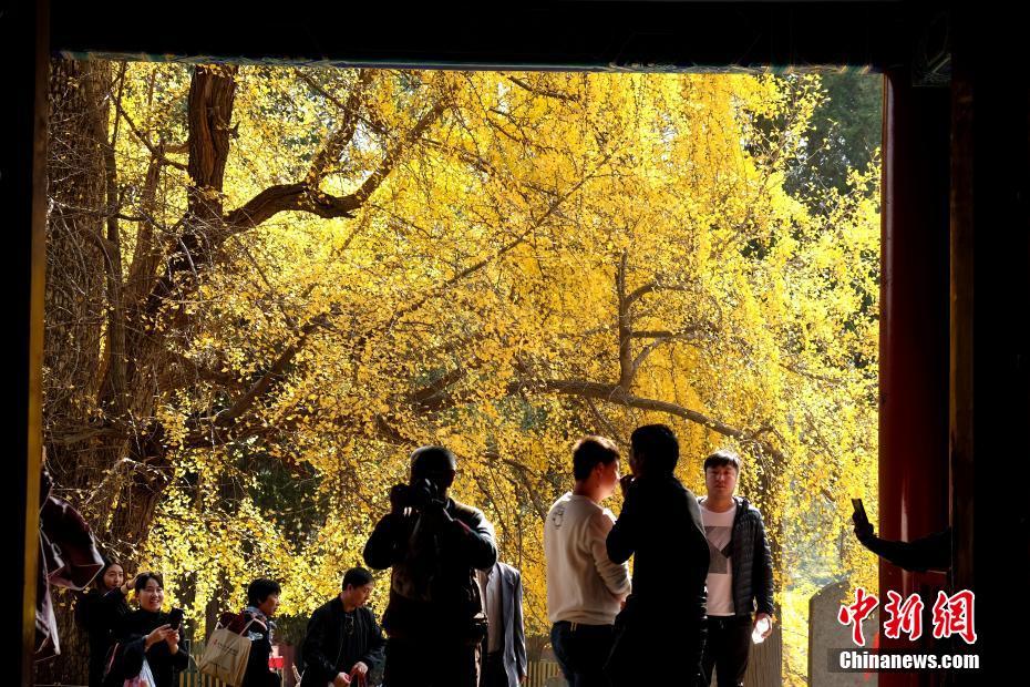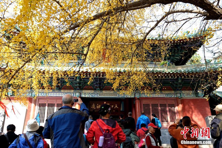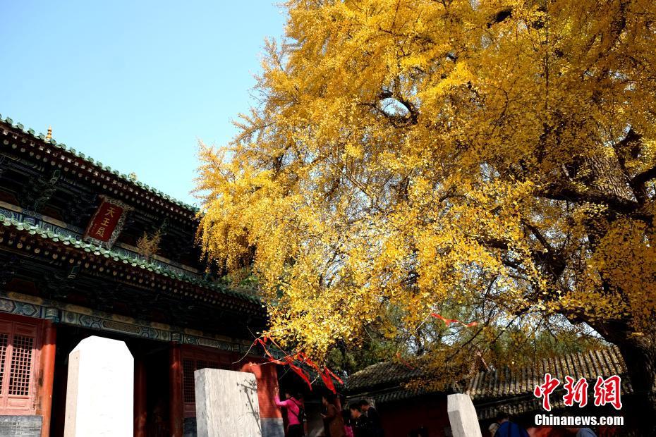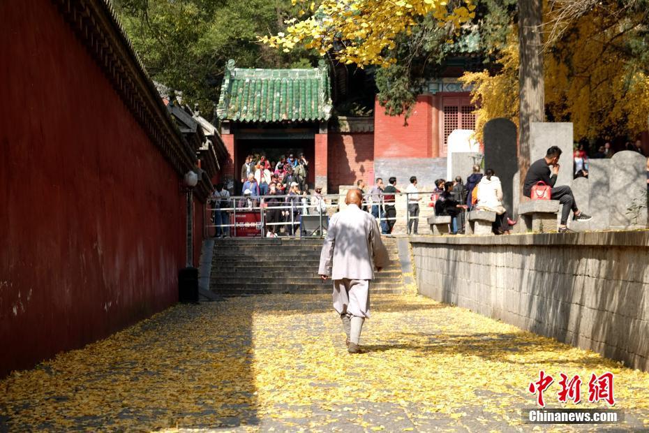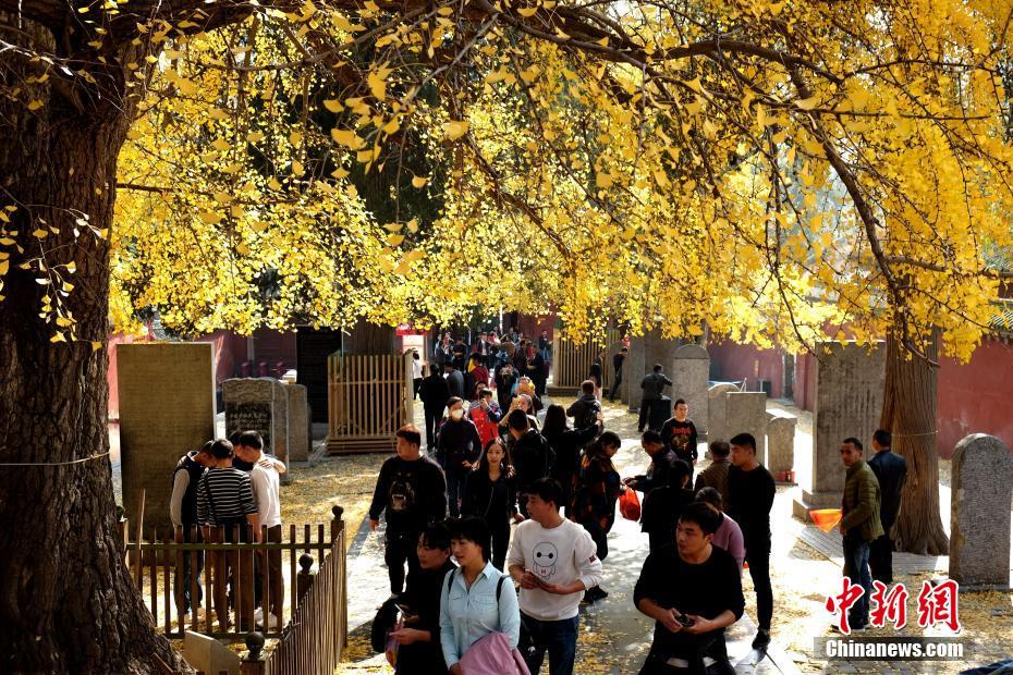 11月7日,河南登封嵩山少林寺内,千年古银杏树一片金黄,吸引民众流连忘返。其中天王殿前最大的一棵古银杏树苍劲挺拔,已有1500多年历史,它高25米,冠幅达37米。 王中举 摄