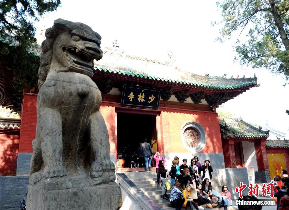 11月7日,河南登封嵩山少林寺内,千年古银杏树一片金黄,吸引民众流连忘返。其中天王殿前最大的一棵古银杏树苍劲挺拔,已有1500多年历史,它高25米,冠幅达37米。图为一些游客在少林寺山门前合影留念。 王中举 摄